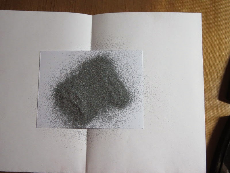 Ik zal hier de uitleg van de tekststempel geven. Stempel de tekst met de versamark inkt op stempelpapier. Vervolgens strooi je er embossingpoeder over. Haal het papier met het afdrukje met een pincet uit het embossingpoeder. Als je een dubbelgevouwen A4 papiertje neemt, dan kan je het embossingpoeder door de vouw zo in je potje terug laten glijden.