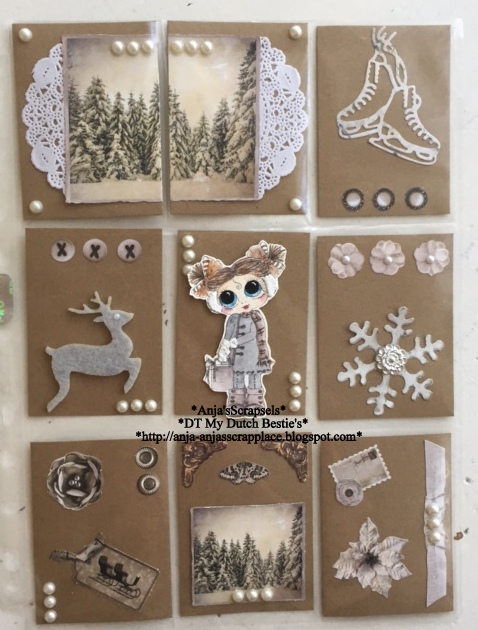 The pattern comes from the internet. I did found it along tine ago. The card section is 14.9 cm. 10.5 cm. and the 2 pieces are 4.5 at 7 cm. It is a double card and you can make it out of an A4. I have the stamp colored with markers and after coloring the color combination came up. The pine cones on the front of the card are dies from Leane creative. You can make 2 types of pine cones of multiple parts. The pieces with the pine cones you can open all the way.